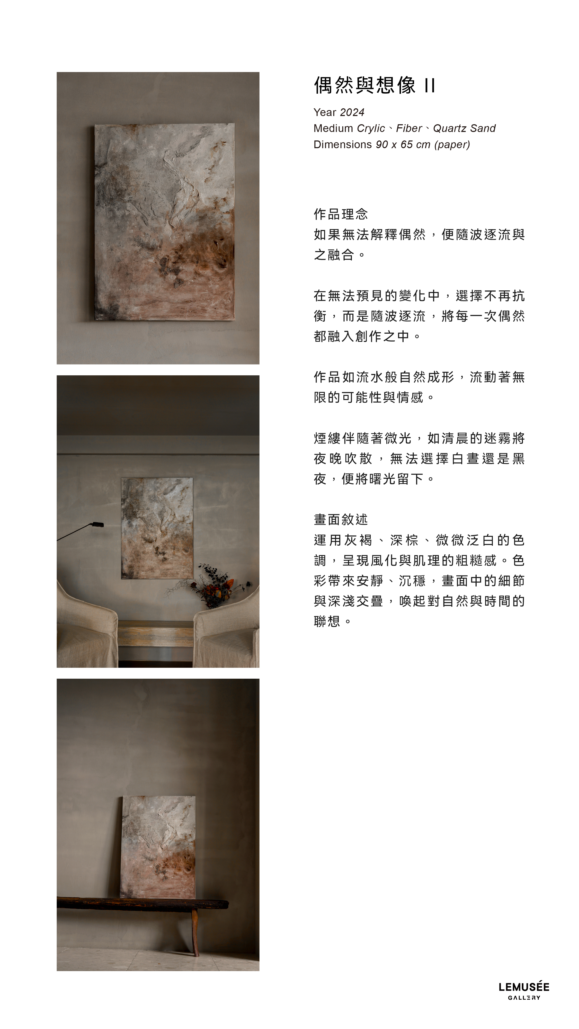 在無法預見的變化中,選擇不再抗衡,而是隨波逐流,將每一次偶然都融入創作之中,作品如流水般自然成形,流動著無限的可能性與情感,煙縷伴隨著微光,如清晨的迷霧將夜晚吹散,無法選擇白晝還是黑夜,便將曙光留下。