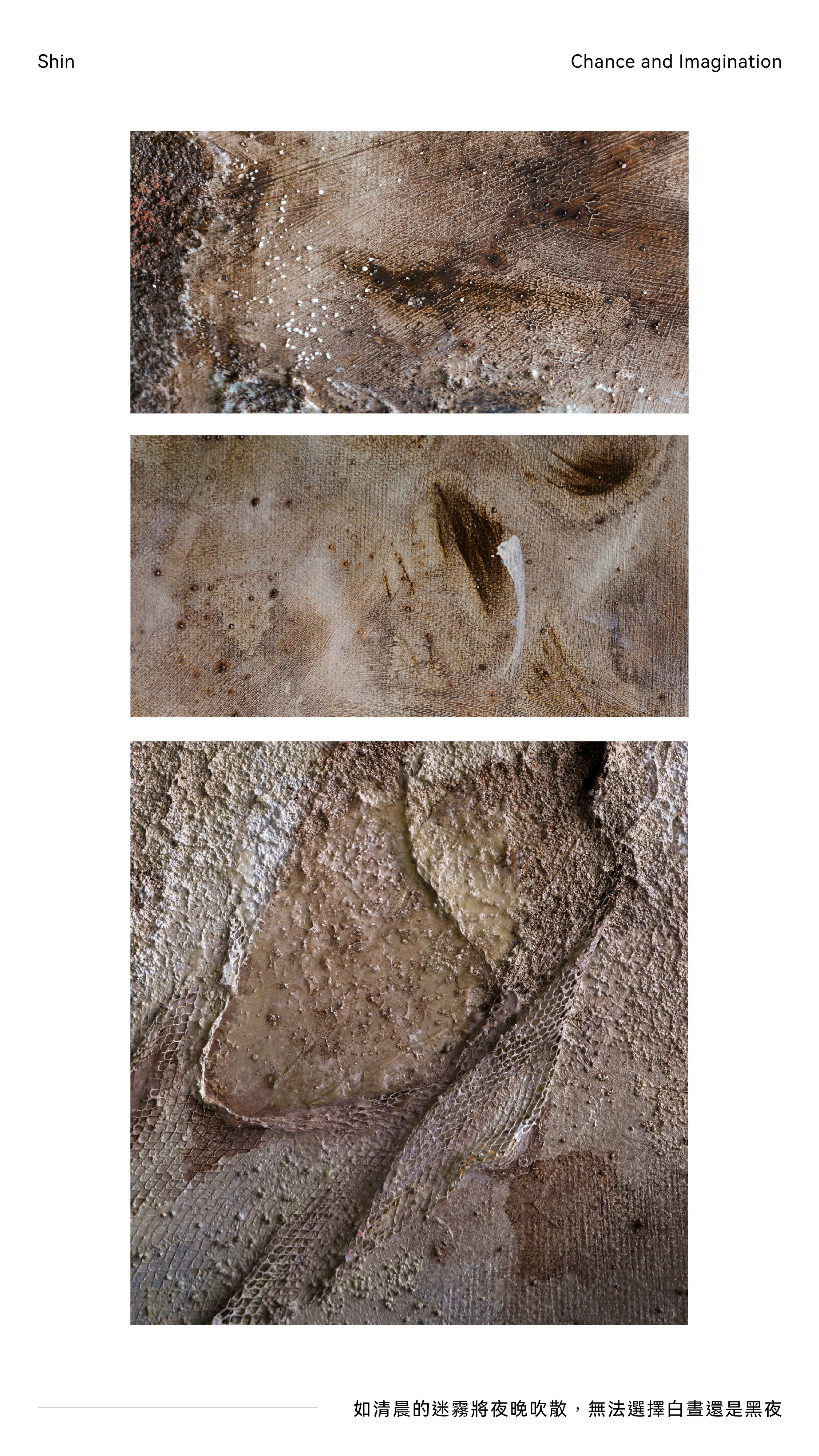運用灰褐、深棕、微微泛白的色調,呈現風化與肌理的粗糙感,色彩帶來安靜、沉穩,畫面中的細節與深淺交疊,喚起對自然與時間的聯想