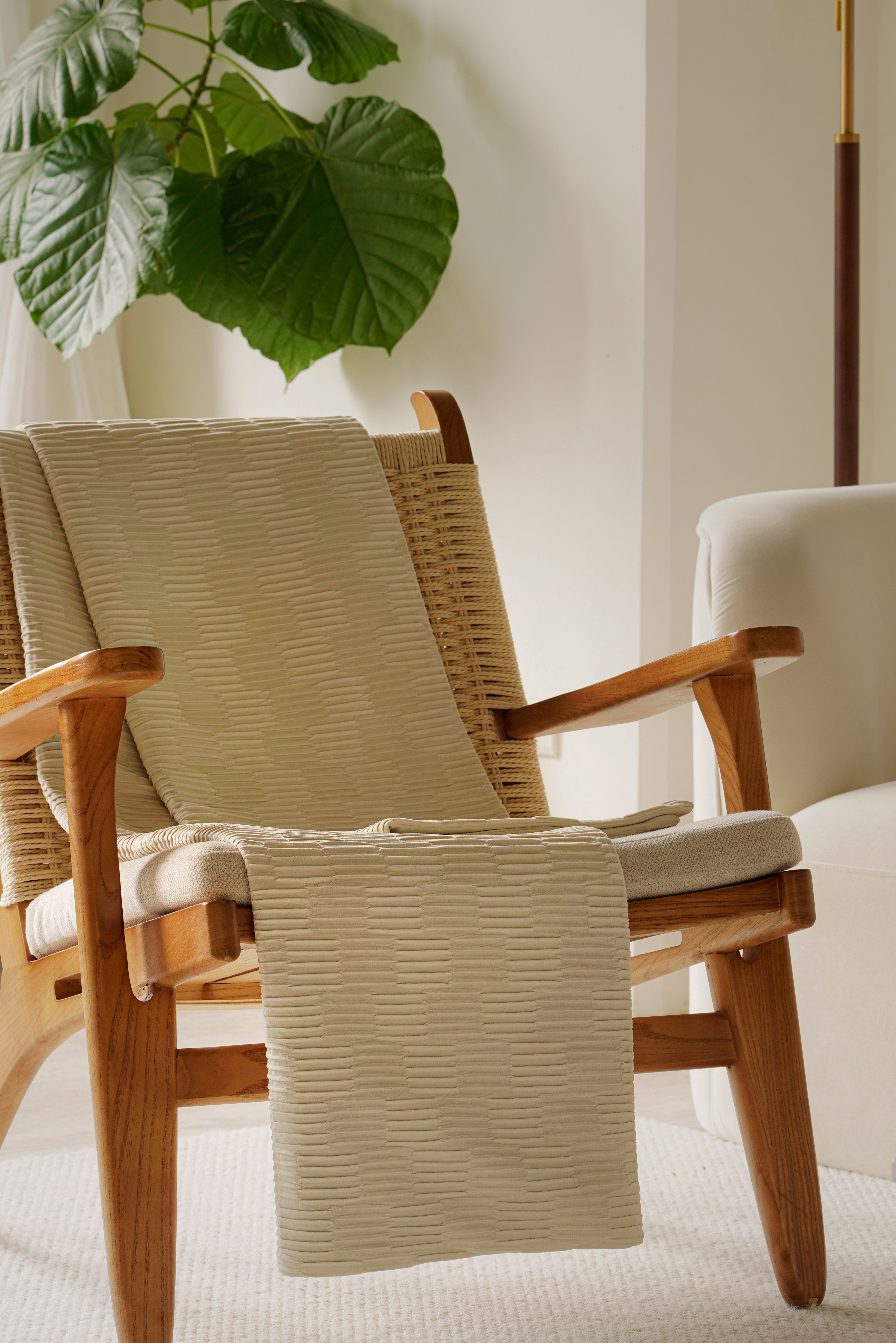 以米白為底,斜角緞面勾勒低調的光澤,褶皺布的細膩紋理如同晨光灑落的絲絨波紋,輕輕鋪展即成為空間的焦點。不論輕搭在沙發或椅背,抑或鋪陳於床尾,皆能流露法式生活的隨性優雅。實用與美感兼具,是點綴居家風景的一抹詩意。