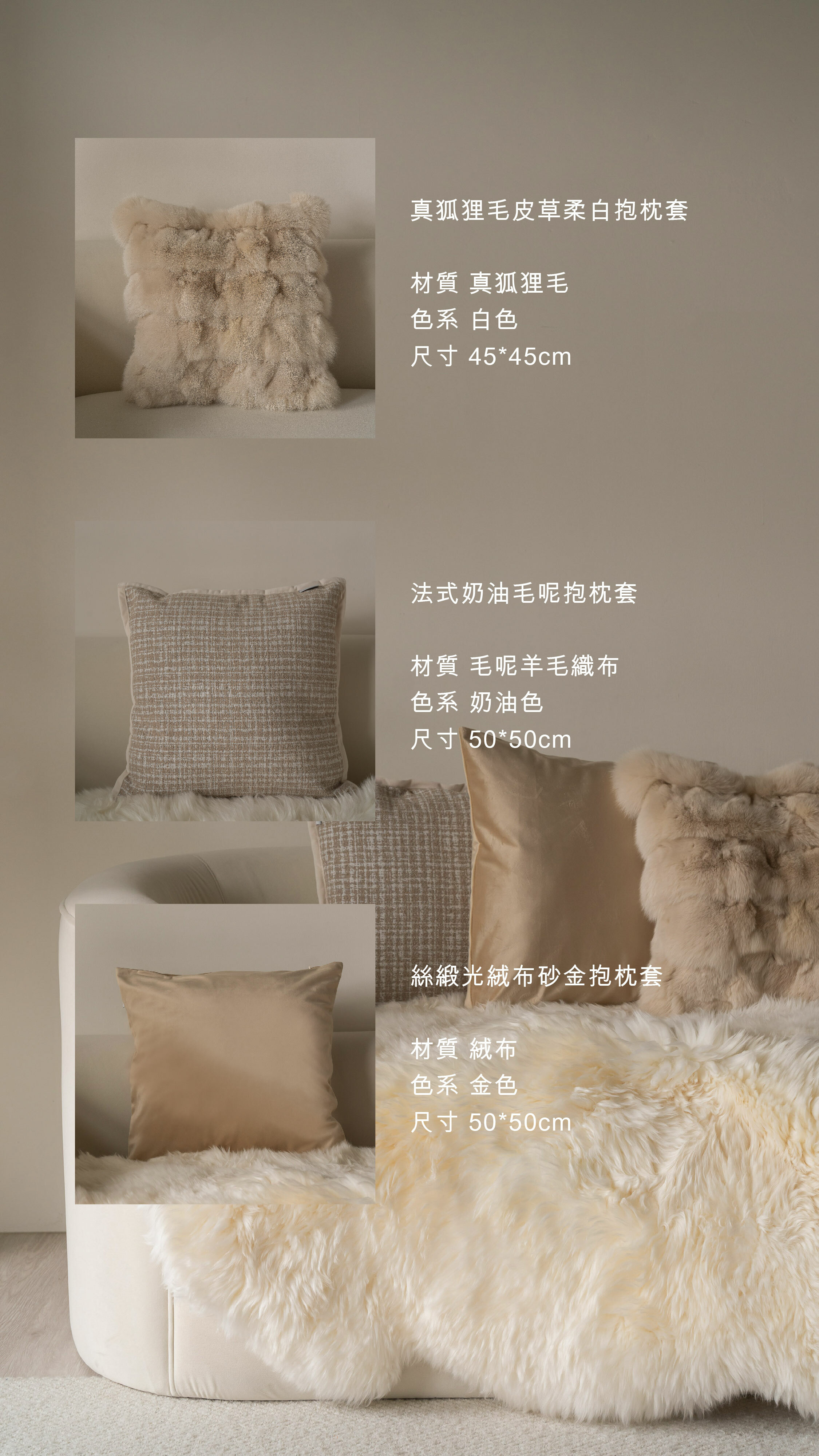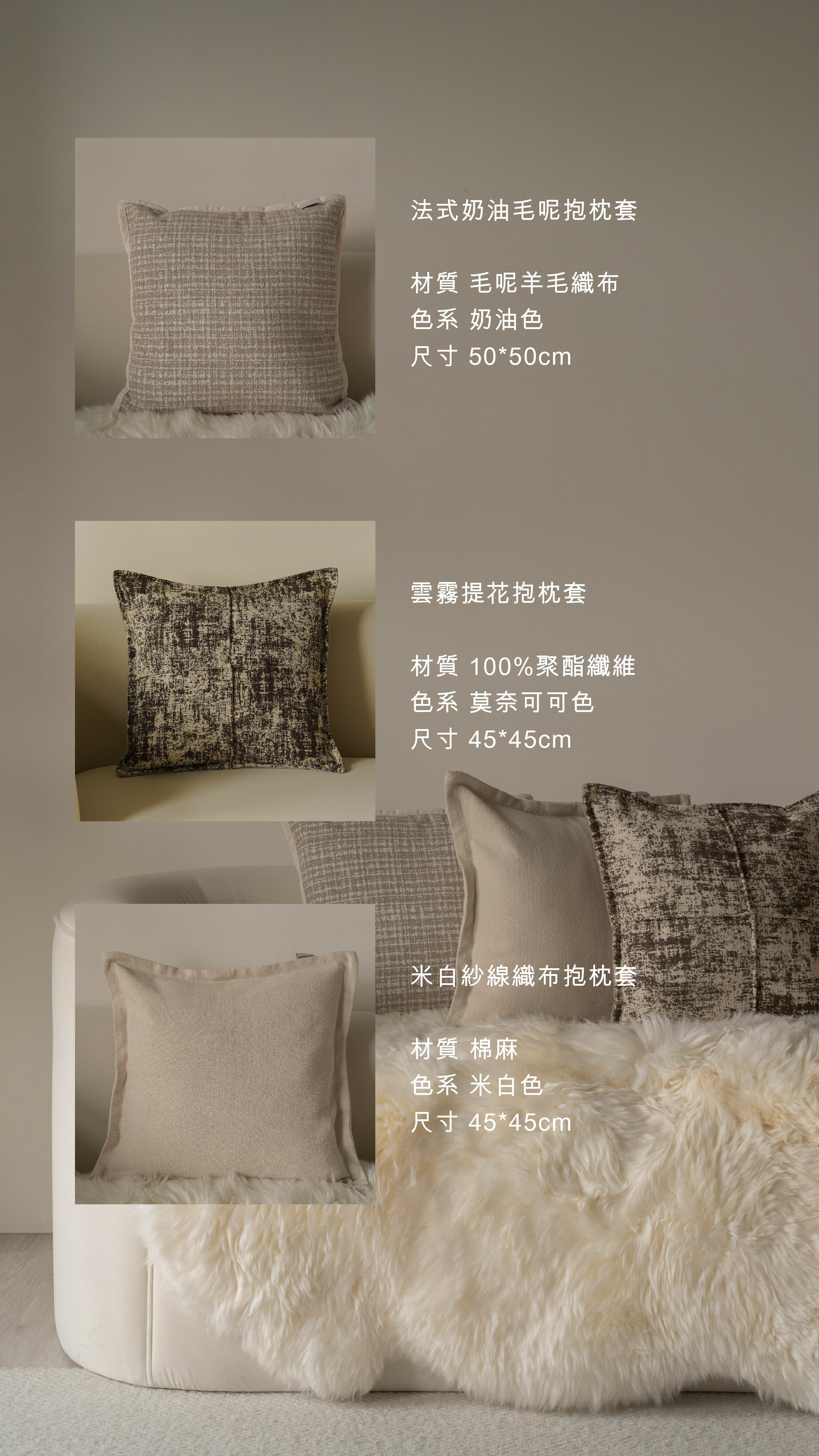 柔軟的羊毛混紡編織,毛呢的精緻紋理,每一根纖維的交織,都猶如一段細膩的詩篇,讓身心在這片柔軟的懷抱中沉浸,譜寫屬於你的愜意時光。融合優雅與溫暖,為空間增添一抹精緻的小香風韻味。"
