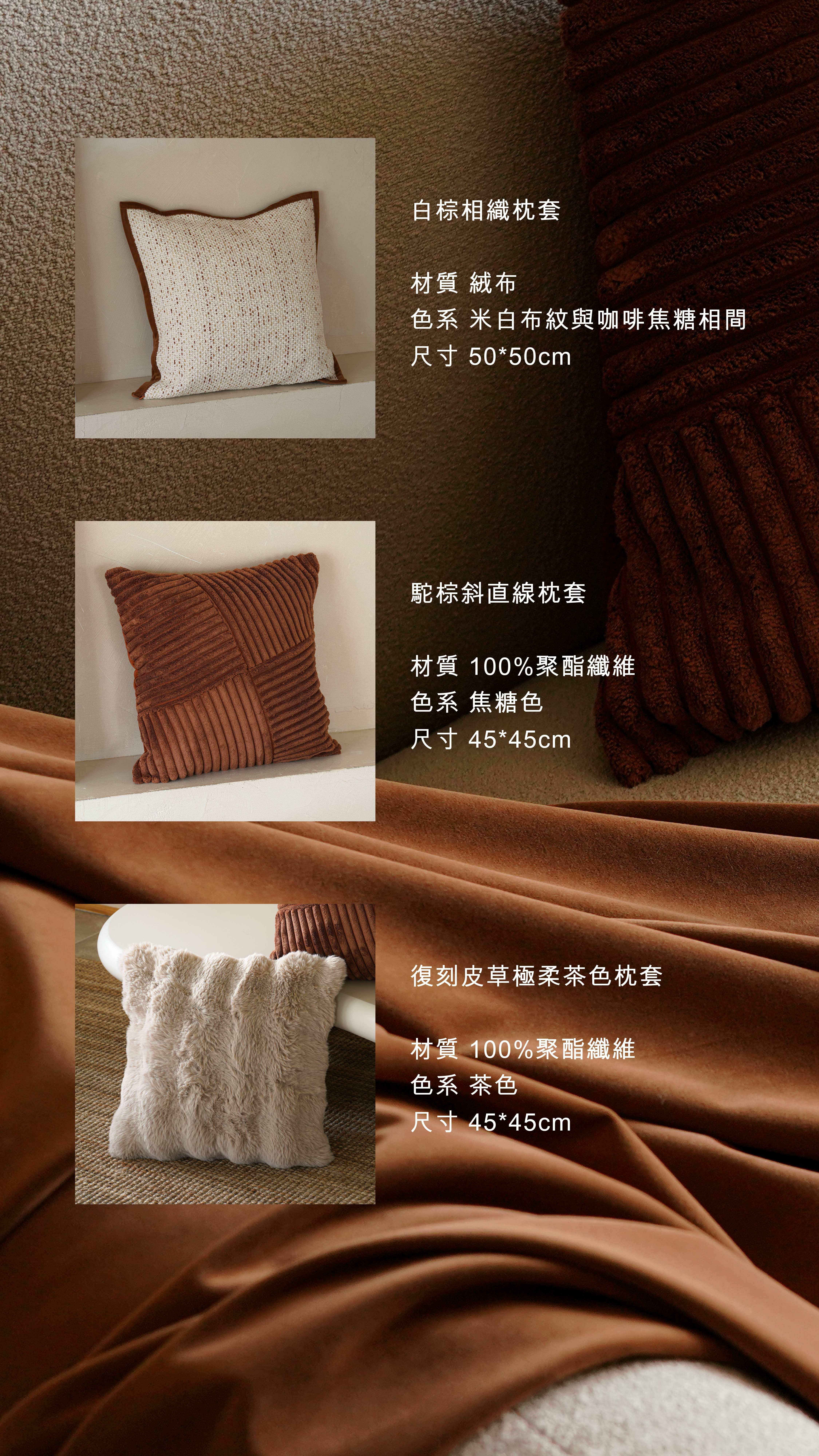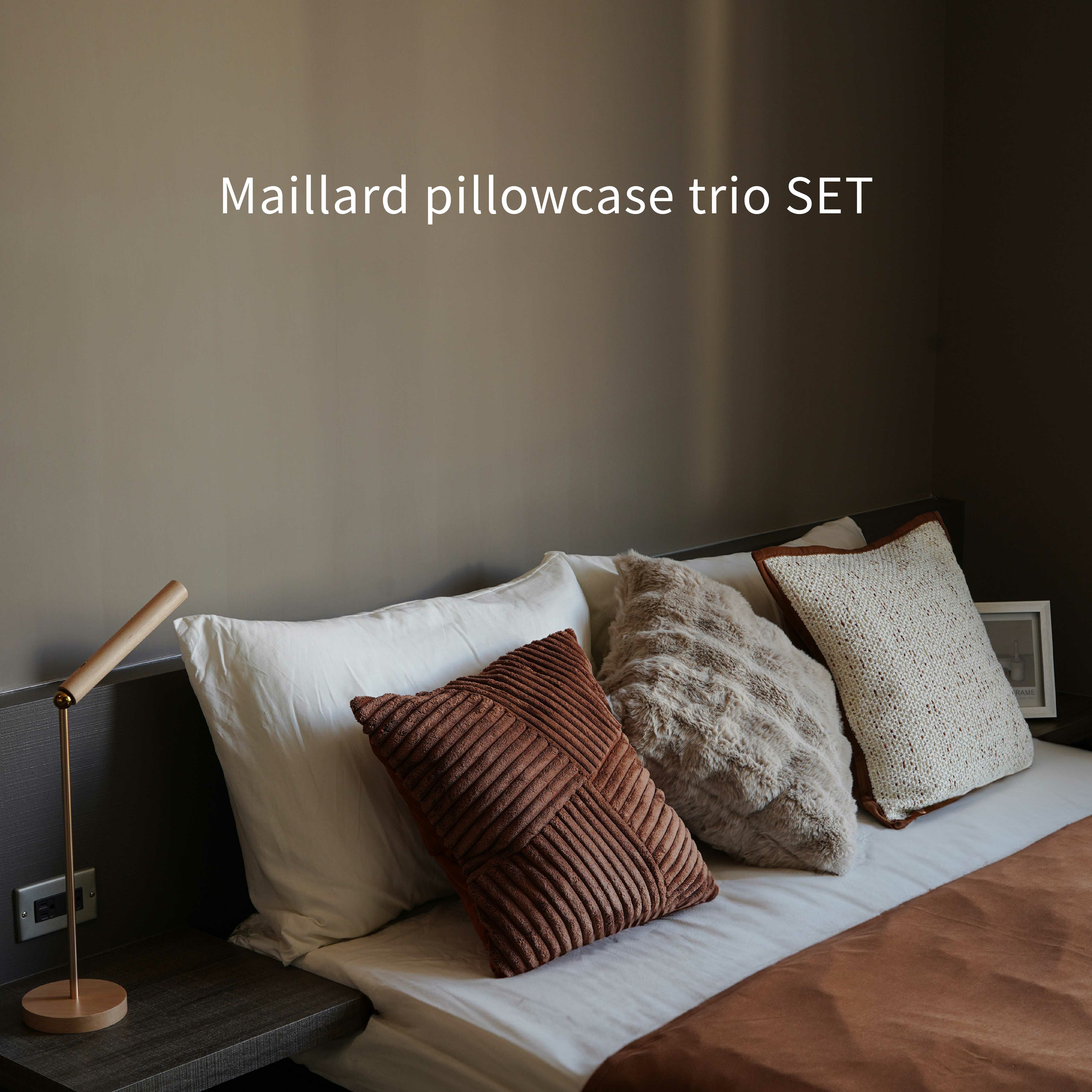 三款獨特的枕套,融合深邃棕色的沉穩與柔和米色的溫暖,每一個細節都在低語著法式的優雅。
