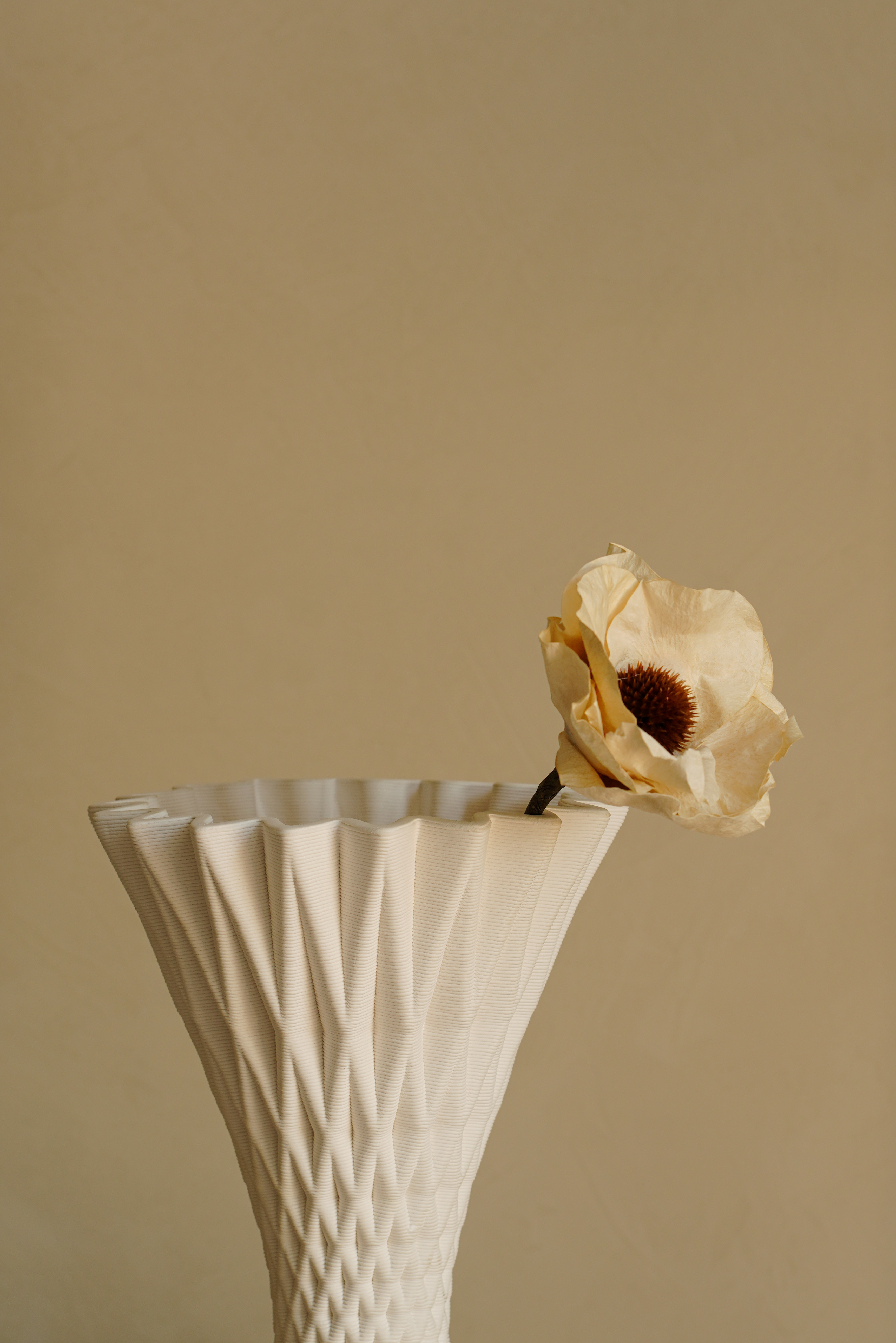 三角圓柱幾何開散圖案,形成出由窄而寬之3D列印絕美花器。