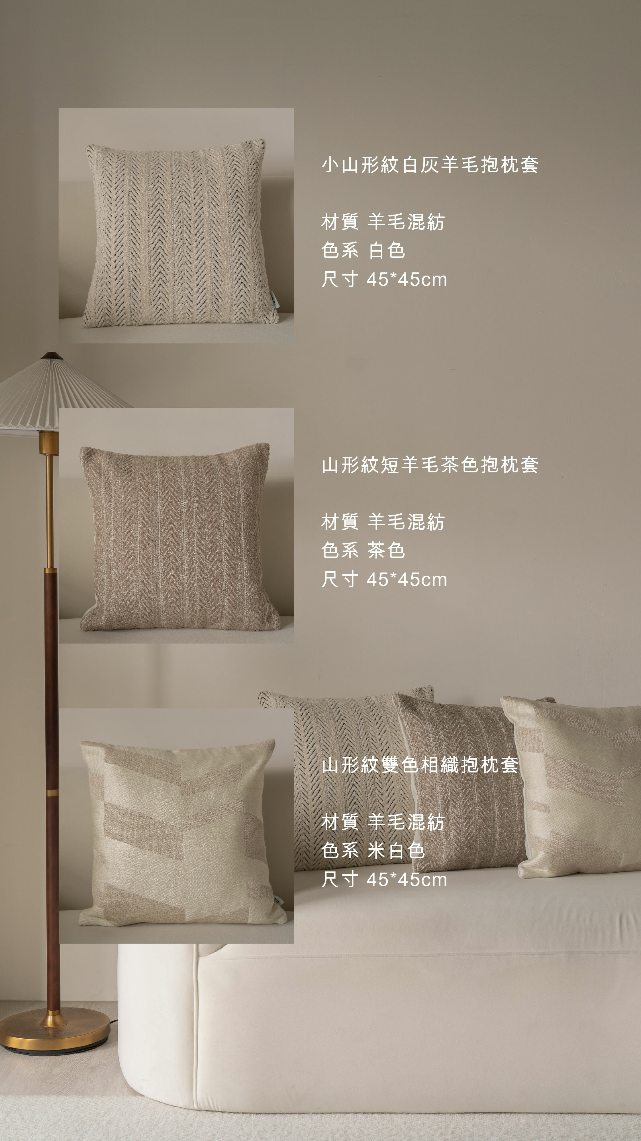 以簡約的山形紋路設計和溫暖的灰白色調,完美呈現侘寂之美。柔軟的羊毛混紡材質,帶來舒適的觸感,輕輕觸摸即能感受到平靜與療癒的力量。其簡約而細緻的質感,不僅是座椅的點綴,更是創造寧靜氛圍的完美元素。